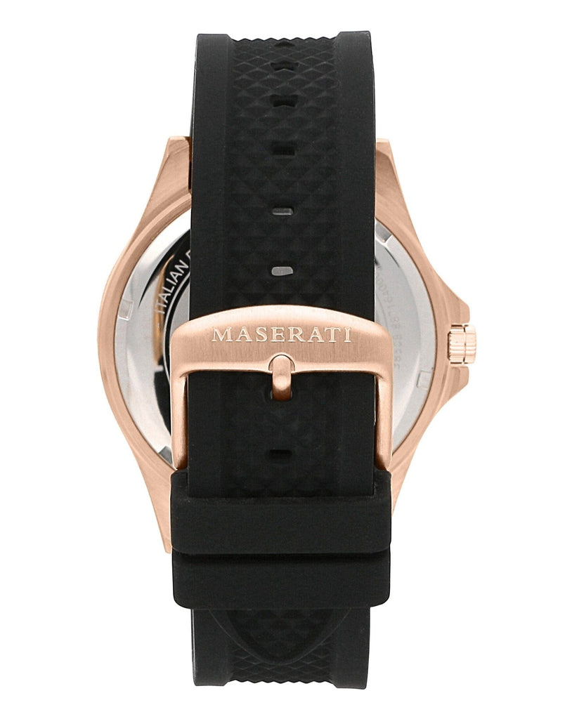 analog watch,rose gold dial, black silicon strap, chronograph, maserati watch
