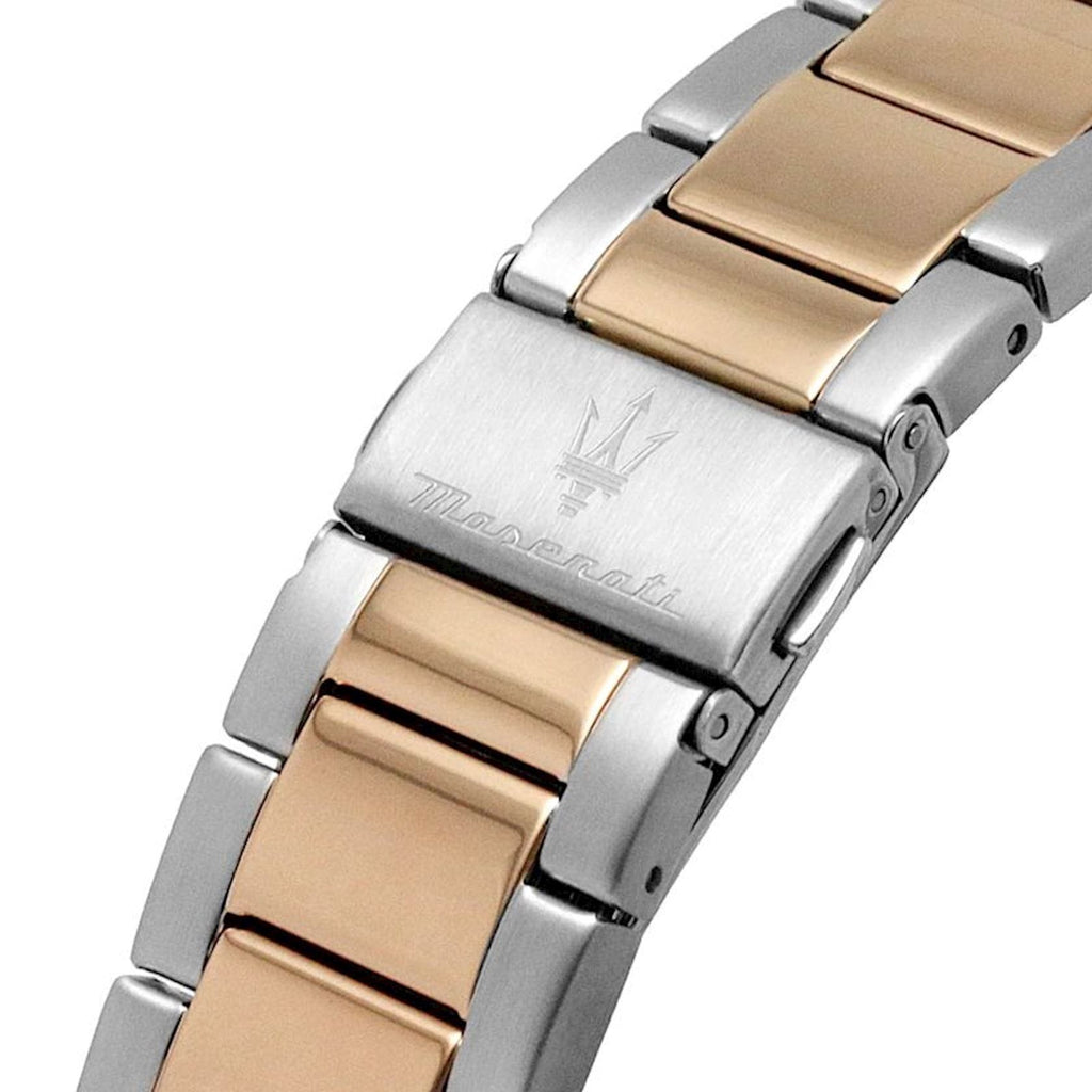 Maserati Mens Sfida Two Tone Blue Dial R8873640012 watch combines a 45mm round shaped stainless steel case and two colour stainless steel bracelet with a push button deployment clasp. It has a blue analogue dial which is protected beneath mineral crystal glass. Power is generated by the quartz movement. This model also has a water resistance of up to 100 metres.