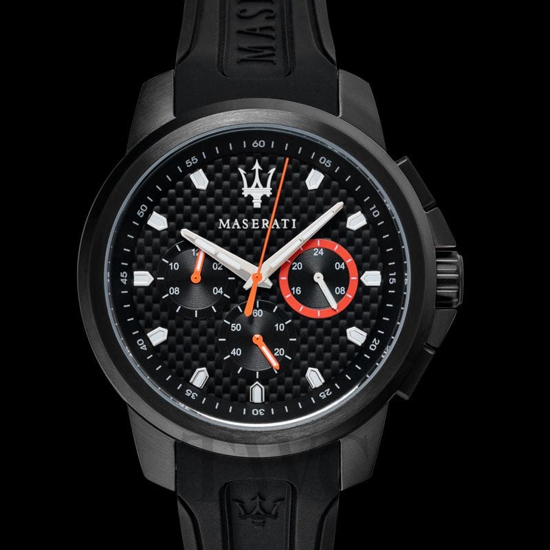 Silver-tone stainless steel case with a black rubber strap. Fixed black stainless steel bezel. Black dial with silver-tone hands and index hour markers. Minute markers around the outer rim. Dial Type: Analog. Chronograph - three sub-dials displaying: 60 second, 12 hour, 24 hour. Quartz movement. Scratch resistant mineral crystal. Pull / push crown. Round case shape. Case size: 44 mm. Water resistant at 50 meters / 165 feet. Functions: chronograph, hour, minute, second. Sport watch style. Maserati Sfida Chronograph Black Dial Men's Watch R8851123007.