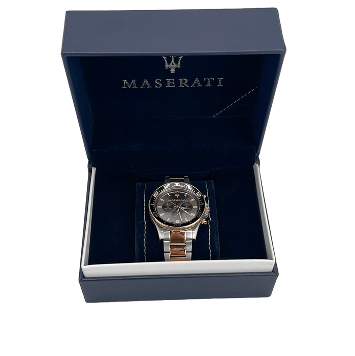 Silver-tone stainless steel case with a two-tone (silver-tone and rose gold-plated) stainless steel bracelet. Uni-directional rotating silver-tone stainless steel with a black ring bezel. Black dial with luminous rose gold-tone hands and index hour markers. Minute markers around the outer rim. Dial Type: Analog. Luminescent hands and markers. Date display between the 4 and 5 o'clock positions. Chronograph - sub-dials displaying: 24 hours, 30 minutes, 60 seconds. Quartz movement. Scratch resistant mineral crystal. Screw down crown. Screwed case back. Round case shape, case size: 44 mm, case thickness: 11.4 mm. Band width: 22 mm. Fold over clasp with a safety release. Water resistant at 100 meters / 330 feet. Functions: chronograph, date, hour, minute, second. Sfida Series. Casual watch style. Maserati Sfida Chronograph Quartz Black Dial Men's Watch R8873640002.