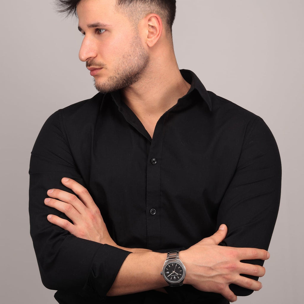 Sporty, lightweight, time only. Stile 3H Watch - Black Dial. The Tridente timepieces embody all of Maserati’s technical expertise and masterful design. Exclusive and inimitable models, with a rigorous design and exceptional functions. The watch case and bezel are made of stainless steel. The silver-coloured hands contrast with the black dial. Three-hand watch with calendar - 45 mm steel case Black dial Steel bracelet
