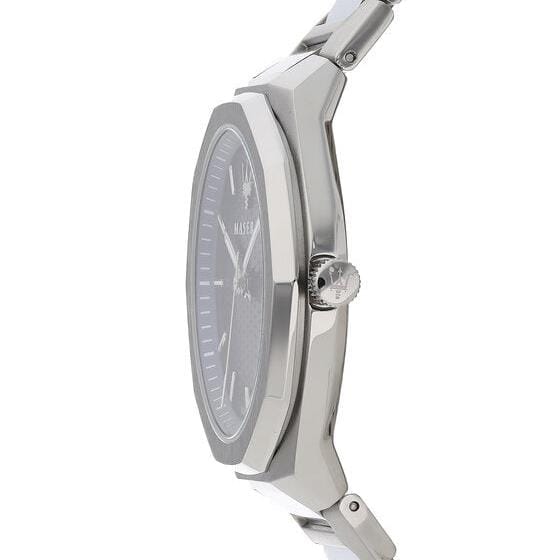 The new Maserati Stile collection plays with clean and well-defined geometry. This watch is characterized by a 42 mm steel case and bezel with exposed Silver screws. The open date perfectly accompanies the Silver colored dial, while the strap reflects the steel of the other elements. Screw-down crown and back, Water Resistant 10 ATM.