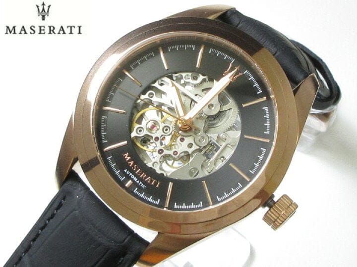 Rose gold-tone stainless steel case with a black leather strap. Fixed rose gold-tone stainless steel bezel. Black/skeleton dial with rose gold-tone hands and index hour markers. Minute markers around the outer rim. Dial Type: Analog. Automatic movement. Scratch resistant mineral crystal. Screw down crown. Transparent case back. Round case shape, case size: 45 mm, case thickness: 13 mm. Band width: 22 mm. Buckle clasp. Water resistant at 100 meters / 330 feet. Functions: hour, minute, second. Dress watch style. Maserati Traguardo Automatic Black/Skeleton Dial Men's Watch R8821112001.