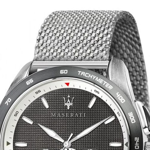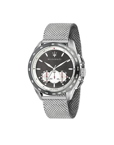 Maserati men's watch R8873612008, from Traguardo Collection, quartz movement, with chronograph. This wrist watch is featured with a stainless steel Milanese mesh band bracelet, with fold over clasp. Its round case, stainless steel finished, is equipped with a grey dial with contrasting white and red details and with a mineral crystal. The knurling detail on the dial and the speedometer bezel give this model a sporty look, with refined colour combinations. Unmistakable details are the in-line stopwatches on the dial, a clear reference to the onboard equipment of Maserati cars.