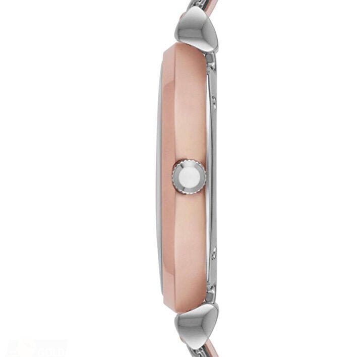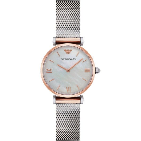 Emporio Armani AR2067 is an amazing and trendy Ladies watch. Material of the case is Two-Tone Steel and Rose Plate and the Mother of pearl dial gives the watch that unique look. In regards to the water resistance, the watch has got a resistancy up to 30 metres. It means it can be worn in scenarios where it is likely to be splashed but not immersed in water. It can be worn while washing your hands and will be fine in rain.