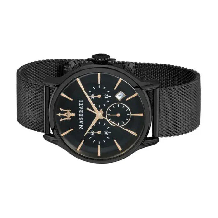 This Maserati Epoca Chronograph Black Dial Men's Watch R8873618006 comes in black stainless steel case with a black stainless steel mesh bracelet. Fixed black stainless steel bezel. Black dial with rose gold-tone hands and index hour markers. Dial Type: Analog. Date display between 4 and 5 o'clock position. Chronograph - sub-dials displaying: three - 60 second, 60 minute and 24 hour. Hattori Caliber VD53 quartz movement. Scratch resistant mineral crystal. Screw down crown. Solid case back. Round case shape, case size: 42 mm, case thickness: 12 mm. Band width: 21 mm. Water resistant at 100 meters / 330 feet. Functions: chronograph, date, hour, minute, second. Casual watch style. Watch label: Japan Movt