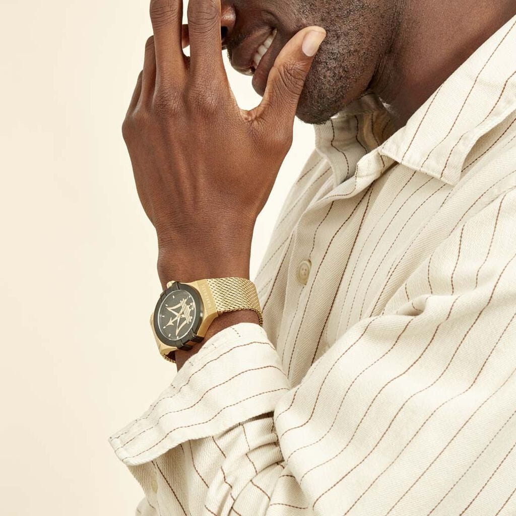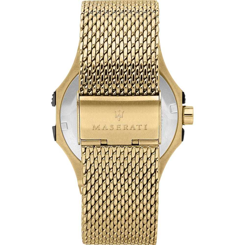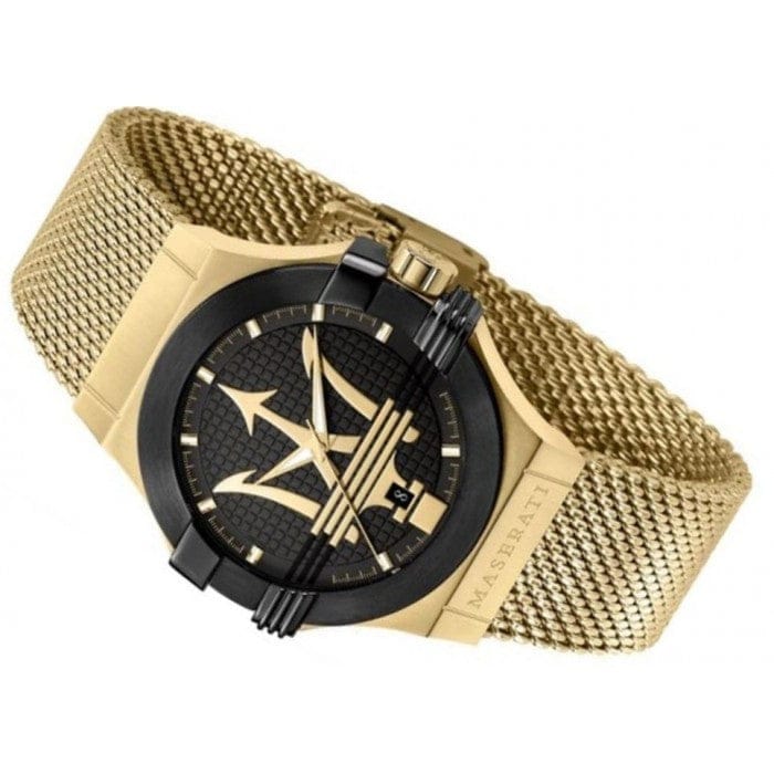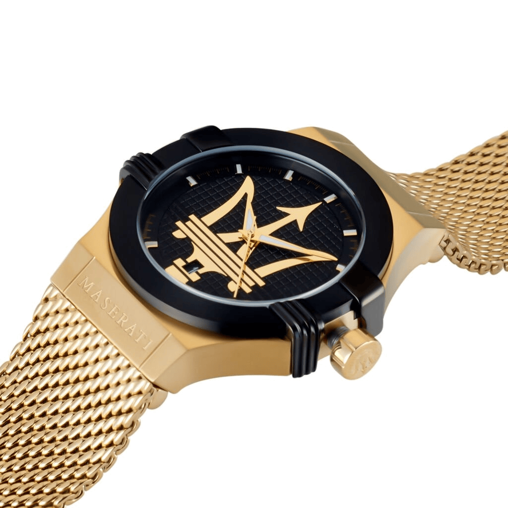 Yellow gold-plated stainless steel case with a yellow gold-plated stainless steel mesh bracelet. Fixed black-plated bezel. Black (Maserati logo) dial with luminous yellow gold-tone hands and index hour markers. Minute markers around the outer rim. Dial Type: Analog. Luminescent hands and markers.