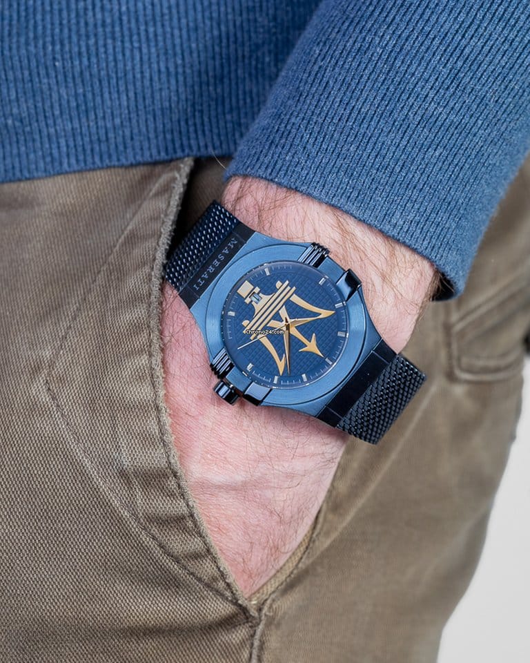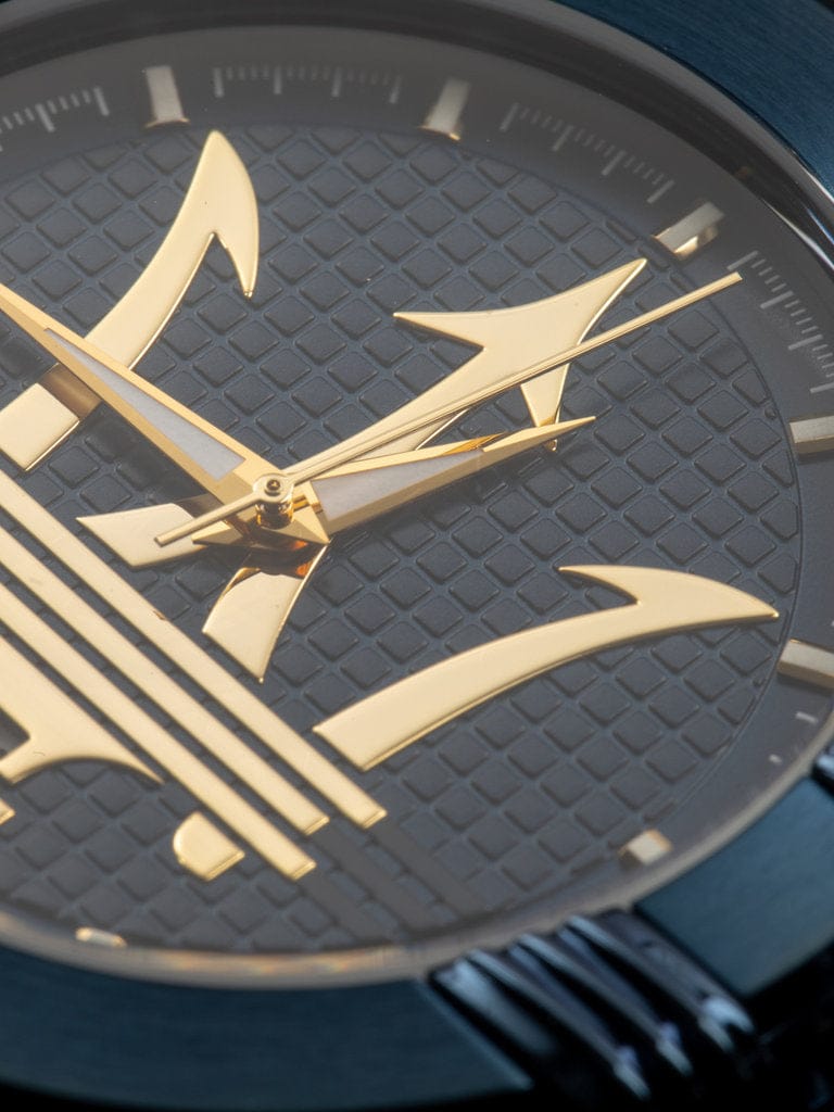 - DIAL COLOUR: Blue structured dial with golden Maserati logo and luminous baton markers.