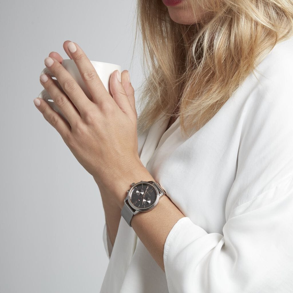 Tommy Hilfiger Blake 1782304 is an incredible eye-catching Ladies watch from Blake collection. Material of the case is Plated Stainless Steel and the Grey dial gives the watch that unique look. 30 metres water resistancy will protect the watch and allows it to be worn in scenarios where it is likely to be splashed but not immersed in water. It can be worn while washing your hands and will be fine in rain.
