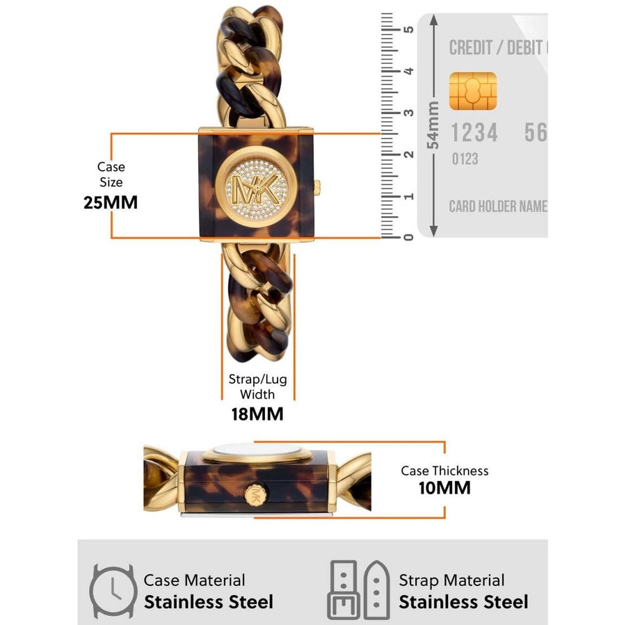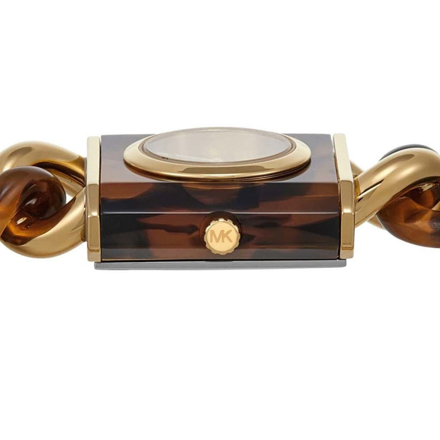 Michael Kors' 25mm MK Chain Lock watch features a gold pavé dial, three-hand movement and tortoise and gold-tone stainless steel bracelet.