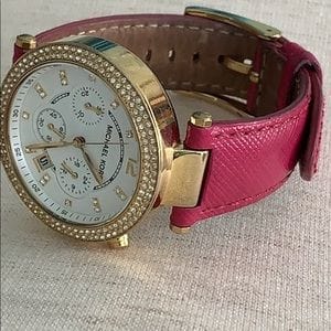 This Michael Kors watch combines style and functionality with its sleek white dial and pink leather strap. The chronograph feature adds practicality, making it the perfect accessory for any woman on the go. Elevate your fashion game with this irresistible timepiece!