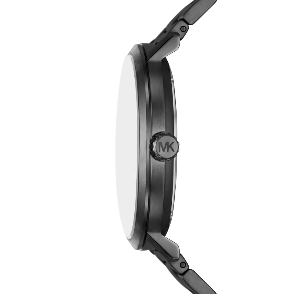 Michael Kors' 42mm Blake watch features a gunmetal sunray dial, three-hand date movement and black stainless steel bracelet. Case & Dial: Round 42mm stainless steel case with a black dial; mineral crystal face resists scratches