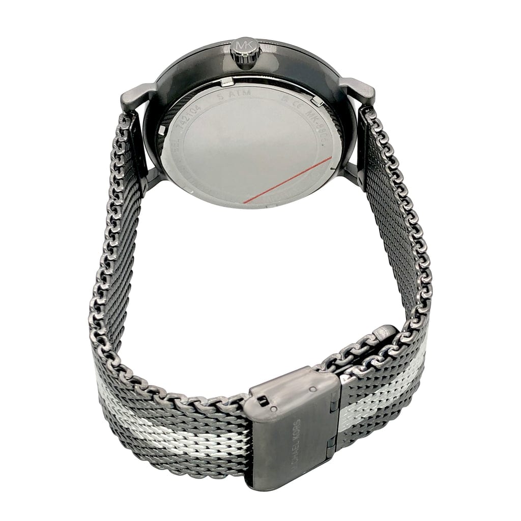 Band: Gunmetal / silver-tone striped stainless steel mesh bracelet. Sliding closure.