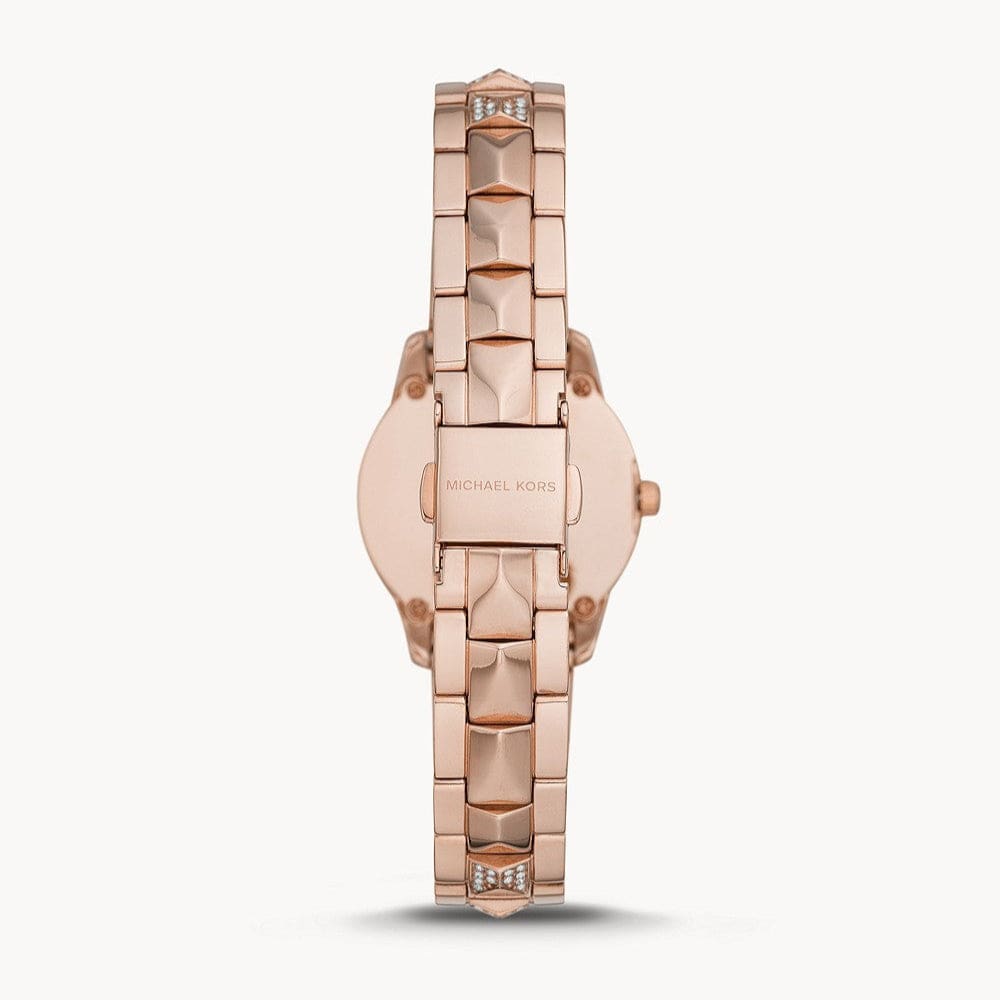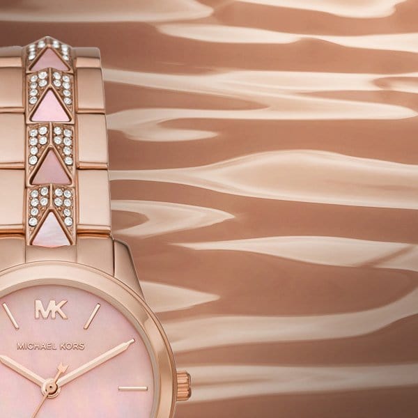This Michael Kors Women's watch features a pink mother of pearl dial with rose gold tone hands and markers, fixed stainless steel bezel and a rose gold tone stainless steel case with a rose gold stainless steel bracelet with pink mother of pearl acetate inserts. Quartz movement with Analog display. Round case shape with a 28 mm case diameter. Scratch resistant mineral crystal. Solid case back. Functions: Hour, Minute, Second. Water resistance up to 50 meters.