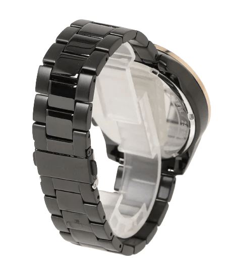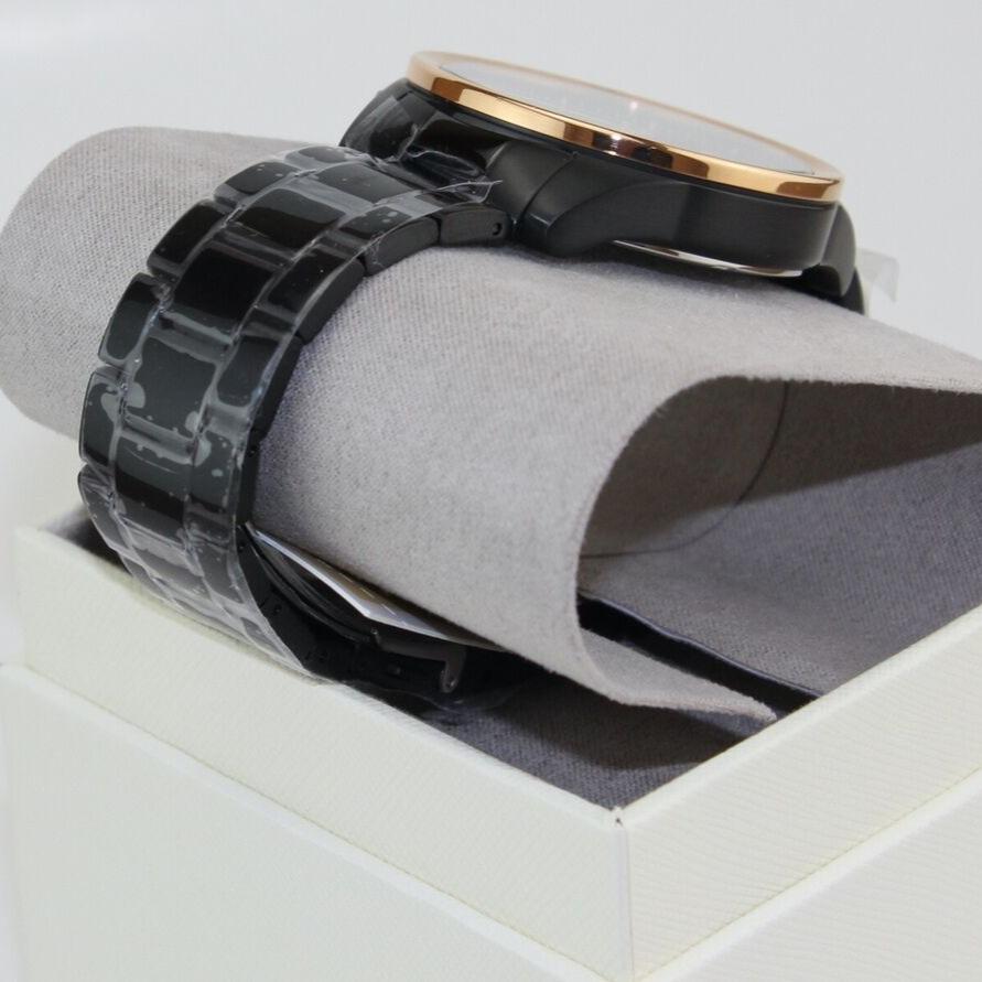Michael Kors' 44mm Wren watch features a black sunray dial with rose gold-tone Roman numeral indexes, black case with rose gold-tone topring, chronograph movement and black stainless steel bracelet.