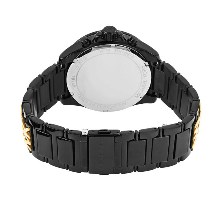 A unique design, this Michael Kors MK6978 Black and Gold Tone Womens Watch is unlike any other. The stainless steel band features a matte black finish patterned with the iconic Michael Kors logo in shiny yellow gold. Embrace luxury with the undeniable class of a black and gold watch, complete with a chronograph and three dials. No matter the occasion, this watch is sure to turn heads, and can be worn from day to night with ease.
