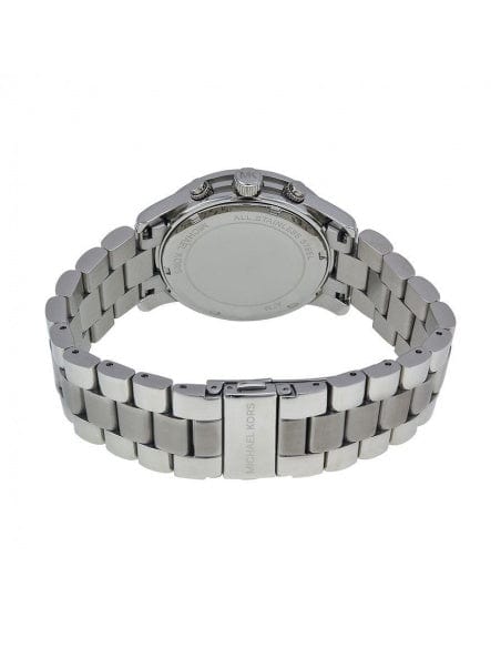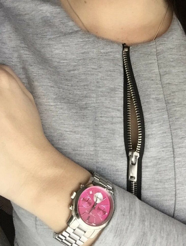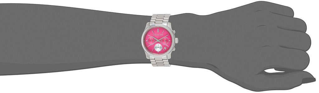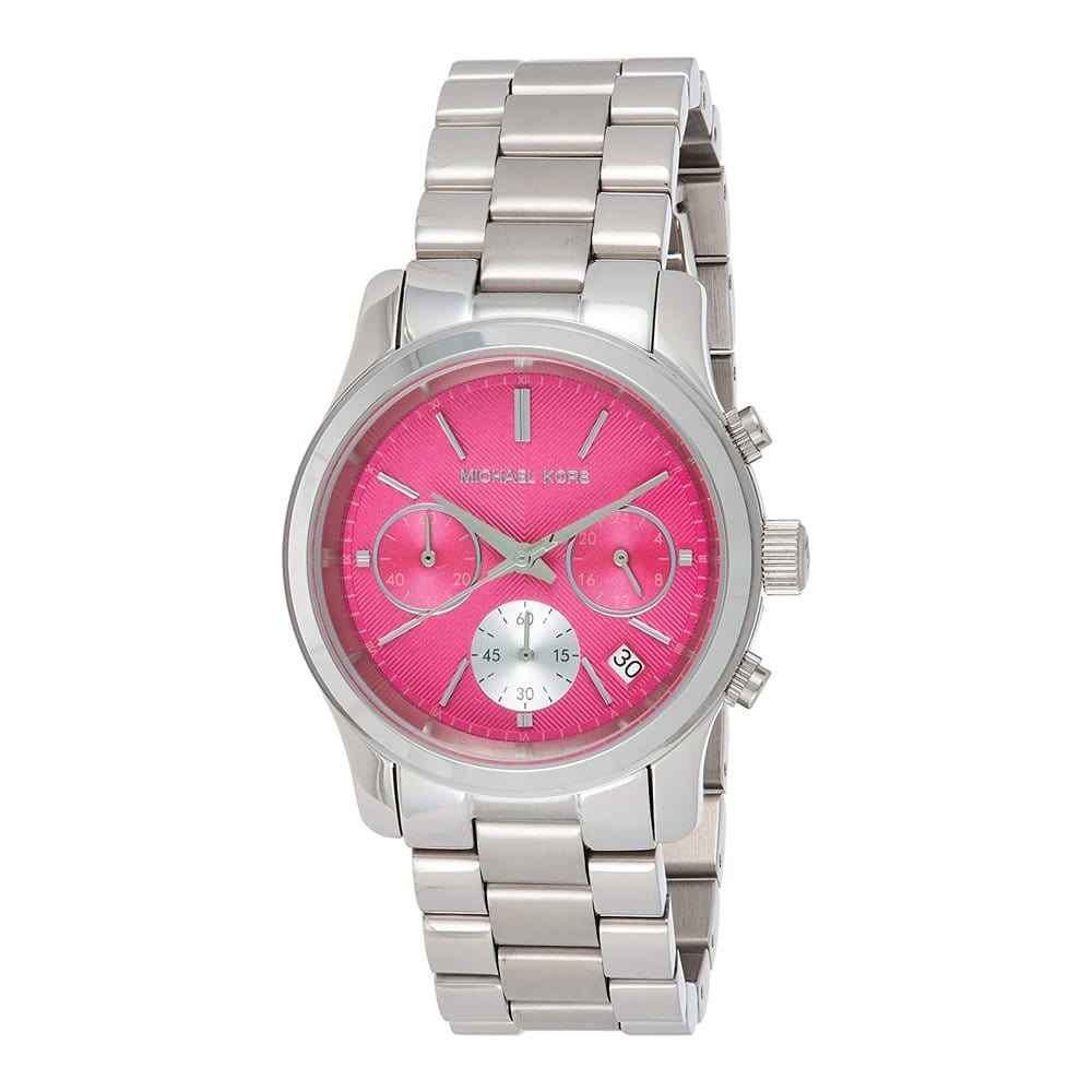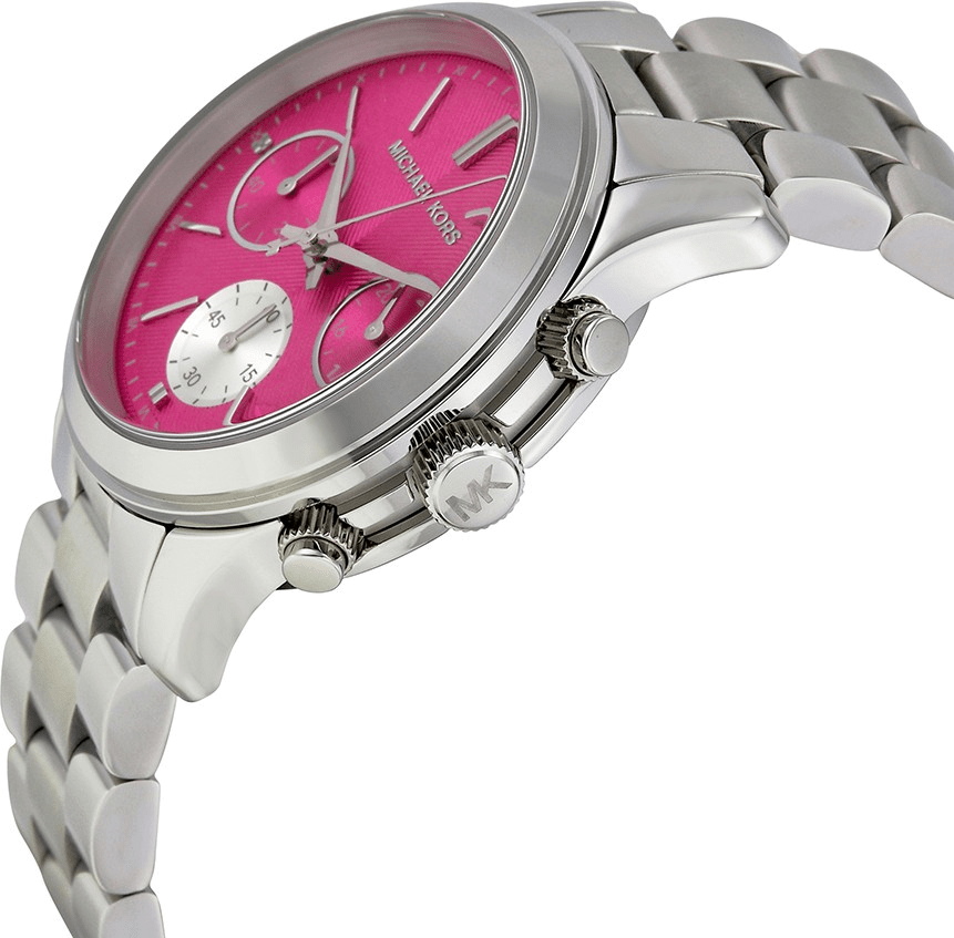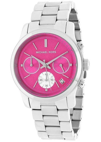 This Michael Runway Chronograph Pink Dial Ladies Watch MK6160 comes in stainless steel case with a stainless steel bracelet. Fixed stainless steel bezel. Pink dial with silver-tone hands and index / Roman numeral hour markers. Minute markers around the outer rim. Dial Type: Analog. Date display between 4 and 5 o'clock positions. Chronograph - three sub-dials displaying: 60 second, 30 minute and 24 hour.