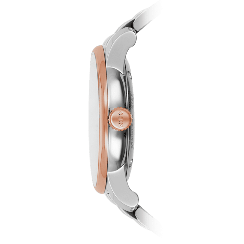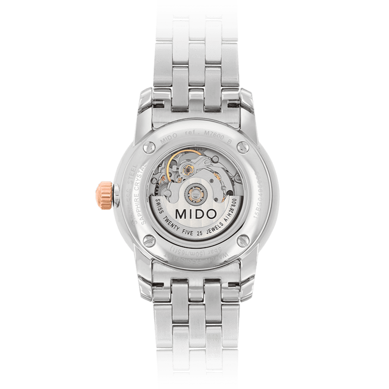 The Baroncelli Tradition Swiss watch honours MIDO's watchmaking heritage in its most timeless form. The harmonious lines and subtles curves bestow both a rare sense of elegance and tradition on this classical collection. Fitted with latest-generation technology, the automatic movement can be admired through the transparent case back.