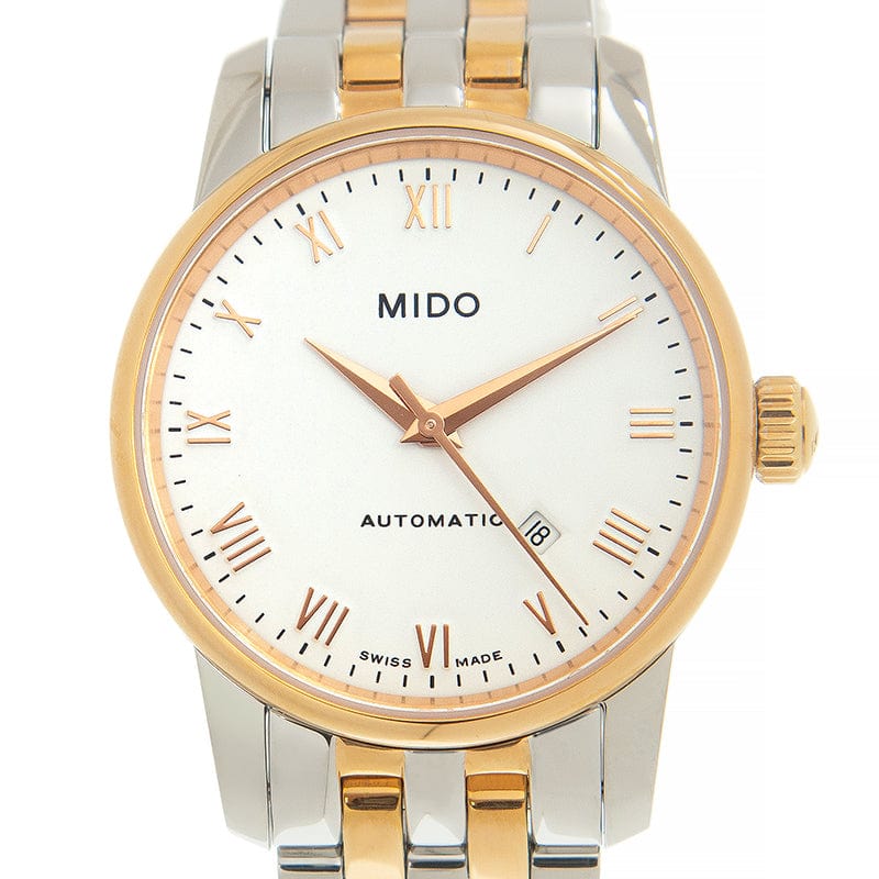 The Mido Baroncelli II features a 29mm stainless steel case, fixed bezel, white dial and scratch-resistant sapphire crystal.
