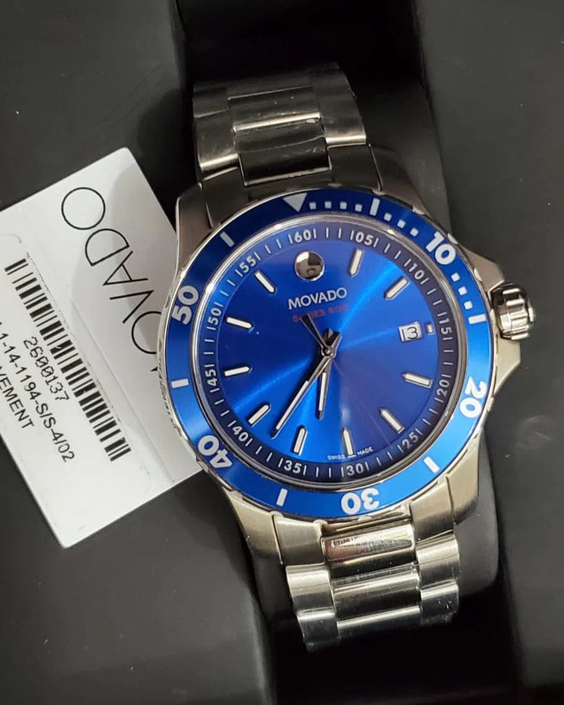 The Movado Series 800 men’s sport watch is a cutting-edge timepiece that lets you bask in an incredibly powerful interpretation of our iconic Museum dial. It features a 40 mm Performance Steel case with a blue aluminum sport bezel and rugged screw-down crown. The round, blue 3-hand dial has a silver-toned signature dot, hands and applied stick markers, printed Arabic minute index, luminescent details, and date display.