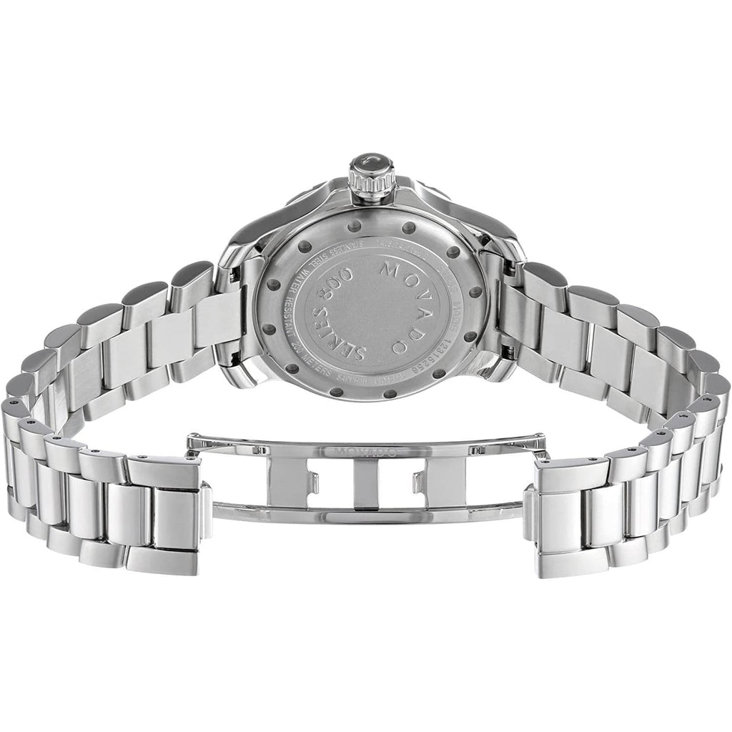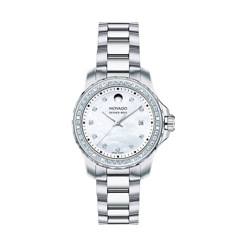 Performance steel case with a performance steel bracelet. Fixed performance steel bezel set with 46 diamonds. White mother of pearl dial with luminous silver-tone hands and diamond hour markers. Minute markers around the outer rim. The Movado dot appears at the 12 o'clock position. Dial Type: Analog. Luminescent hands. Date display at the 3 o'clock position. Quartz movement. Scratch resistant sapphire crystal. Screw down crown. Solid case back. Round case shape, case size: 29 mm, case thickness: 9.3 mm. Band width: 13.6 mm. Deployment clasp with a push button release. Water resistant at 200 meters / 660 feet. Functions: date, hour, minute, second. Additional Info: 0.334 t.c.w. diamonds. Dress watch style. Watch label: Swiss Made. Movado Series 800 White Mother of Pearl Dial Ladies Watch 2600120.