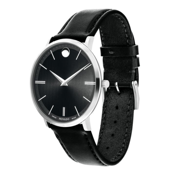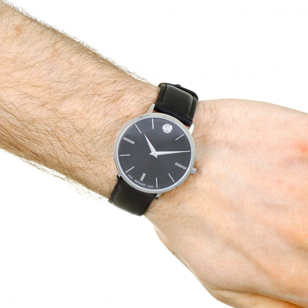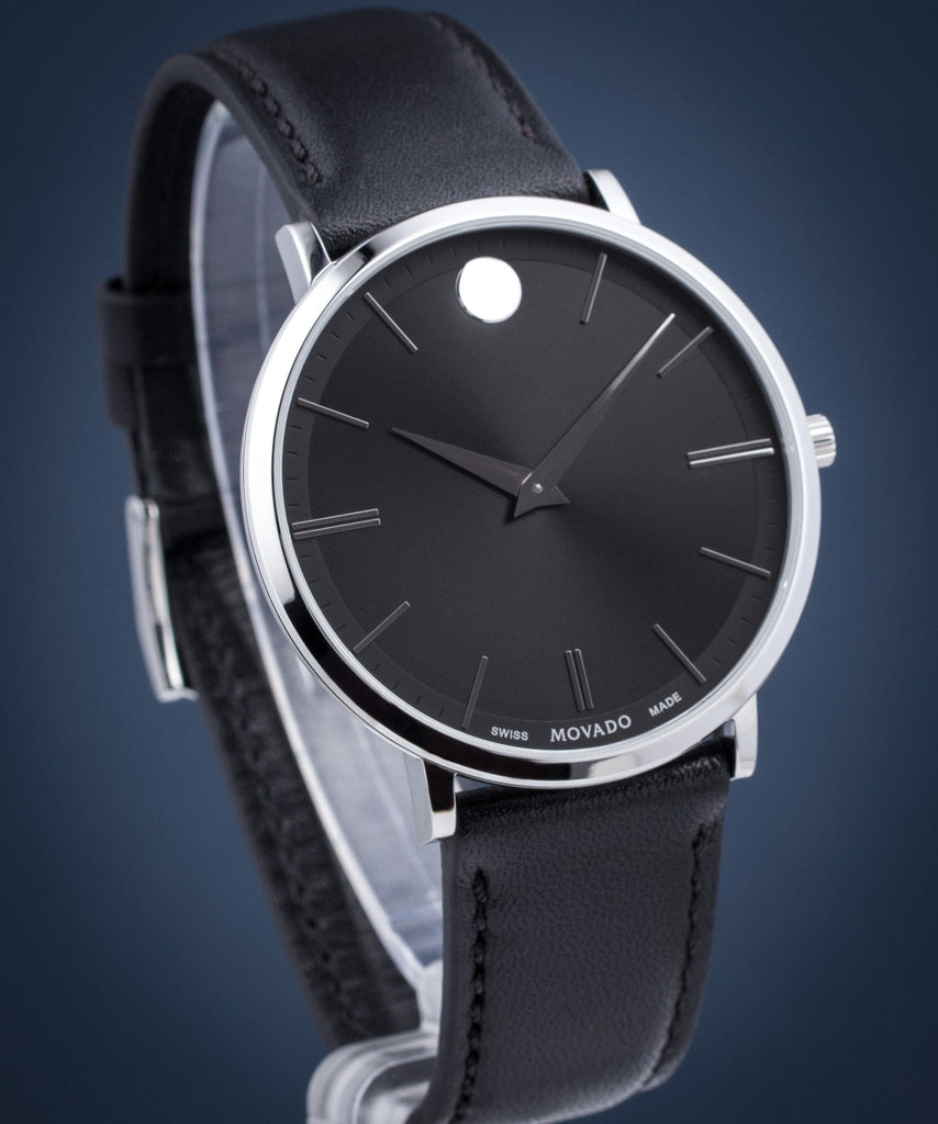 Movado Ultra Slim Black Dial Black Leather Strap Watch For Men - 0607086