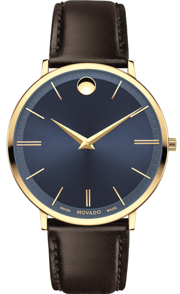 Yellow gold-tone stainless steel case with a chocolate brown calfskin leather strap. Fixed yellow gold-tone bezel. Blue sunray dial with gold-tone hands and index hour markers. The Movado dot appears at the 12 o'clock position. Dial Type: Analog. Quartz movement. Scratch resistant sapphire crystal. Pull / push crown. Solid case back. Case size: 40 mm. Case thickness: 6.3 mm. Round case shape. Band width: 20 mm. Tang clasp. Water resistant at 30 meters / 100 feet. Functions: hour, minute. Dress watch style. Watch label: Swiss Made. Movado Ultra Slim Blue Sunray Dial Mens Watch 0607088.