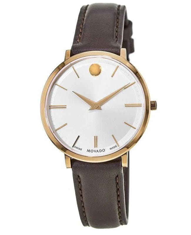 Brand New Authentic Movado Ultra Slim Women's Dress Watch Model 0607093. Rose Gold PVD-finished stainless steel case with Chocolate Brown calfskin with matching top-stitching on strap. Tang clasp. Fixed bezel. Dial description: Silvered-White CD-cut dial with fine concentric-circles texture on dial. Quartz movement. Push In crown. Scratch Resistant Sapphire crystal. Case size: 35mm. Case thickness: 5.85mm. Solid case back. 30 Meters - 100 Feet water resistant. 2 year warranty. Also known as model: 607093.