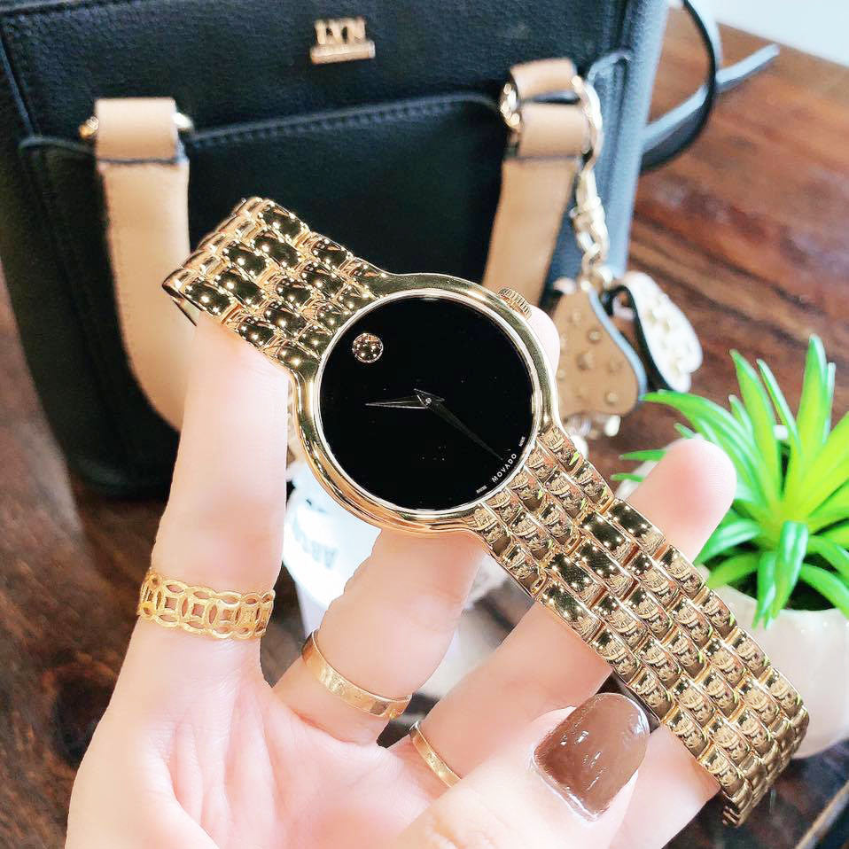 Movado Veturi Men's Watch Round Black Face Gold Metal Strap 0606934 quartz movement (battery), Swiss, round face, black, dot/smooth dial, sapphire glass, watch face diameter 38mm, 7mm thick, case made of stainless steel, sealed bottom cover, water resistant 3atm, metal strap, gold color, 20mm wide, dress watches style.
