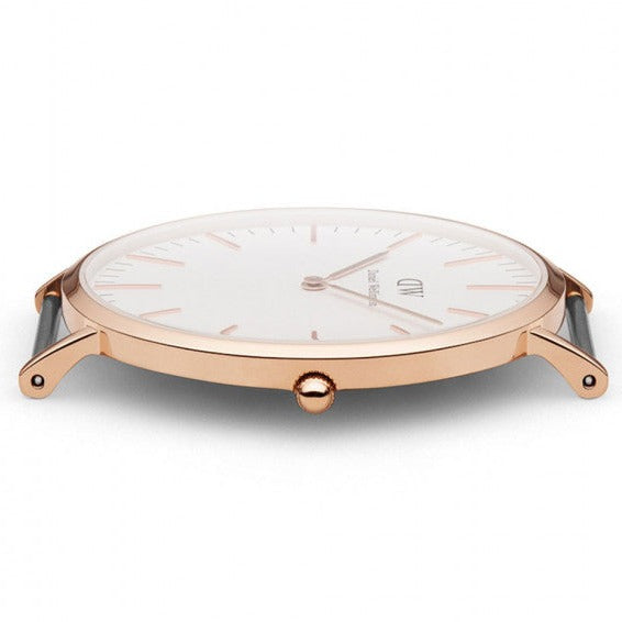 The original Daniel Wellington men's watch 0108DW, from the Nottingham collection, is part of the Casual watch category. The clock mechanism is a quartz one, housed in a round case with an opaque cover. The diameter of the case is 40 mm, and the thickness is 6 mm. The Daniel Wellington 0108DW watch has a nato (nylon) strap and an analog dial, covered by a mineral crystal glass. Water resistant to a depth of 30 m (3 atm), the watch has the following functions: hour, minute.