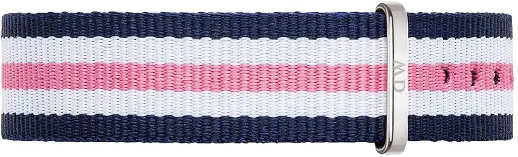 This slim-line Daniel Wellington Classic Southampton Silver Ladies Watch features a 36mm Polished Stainless Steel case, White Dial and fitted with a high quality Japanese quartz movement. This model is supplied with a signature Blue, White and Pink Nato strap.
