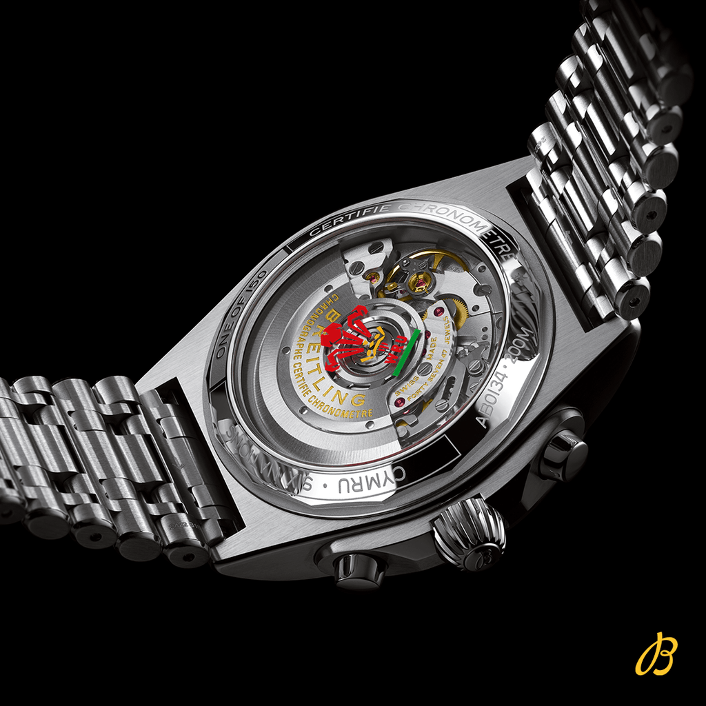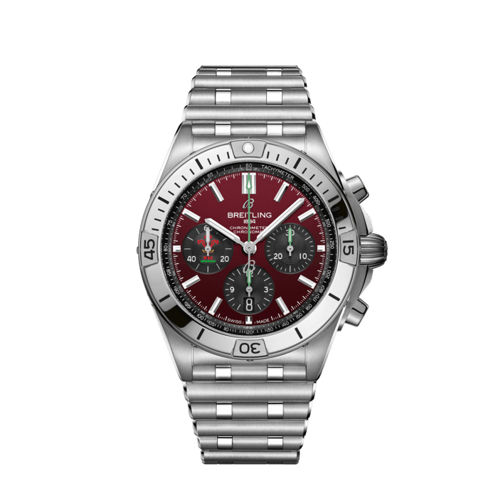 Power is generated by the in-house Breitling Manufacture Calibre 01, a COSC-certified chronometer movement with 47 jewels which has a power reserve of 70 hours and vibrates 28,800 times per hour. The movement can be seen through the clear screwed in sapphire crystal case back that features the Welsh rugby union badge on the glass. Features also include a steel unidirectional bezel, a lug width of 22/20mm, and a water resistance of up to 200 metres. This watch also weighs approximately 198g. • Powered by the in-house Breitling Manufacture Calibre 01, a COSC-certified chronometer movement. • Stainless steel rouleaux bracelet and finished with a fold over clasp. • 42mm case size with 200m water resistance. • Limited to 150 pieces. • Team logo positioned in the sub dial at 9 o’clock.