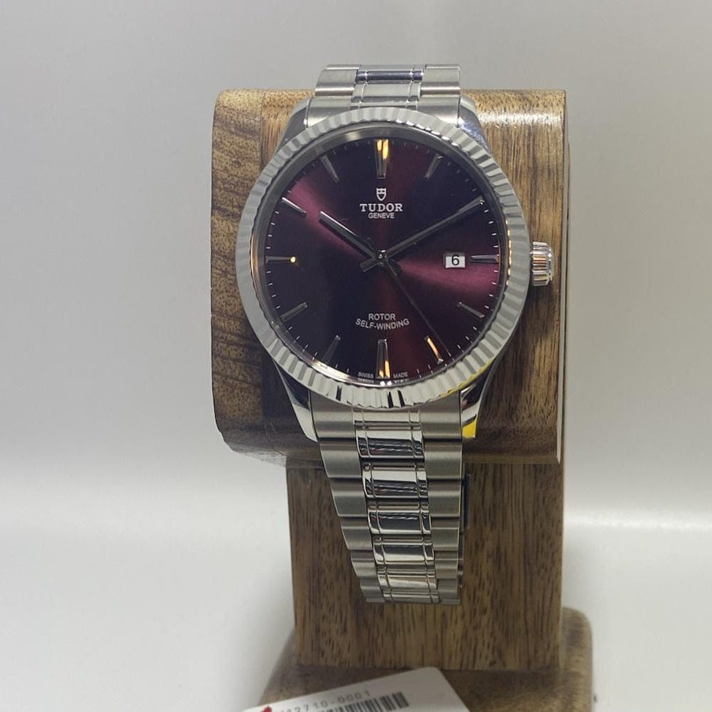 Tudor Style 41mm Burgundy Dial Stainless Steel Unisex Watch Model M12710-0015. Stainless Steel case with Stainless Steel watch band. Deployment clasp. Fluted bezel. Dial description: Silver hands and Index hour markers with minute markers around the outer rim on a Burgundy dial. Automatic Self Winding movement. Powered by Tudor Calibre 2824 engine with 38 hours power reserve. Watch functions: Date, Power Reserve, Hour, Minute, Second. Screw Down crown. Scratch Resistant Sapphire crystal. Round case shape. Case size: 41mm. Solid case back. 100 Meters - 330 Feet water resistant.