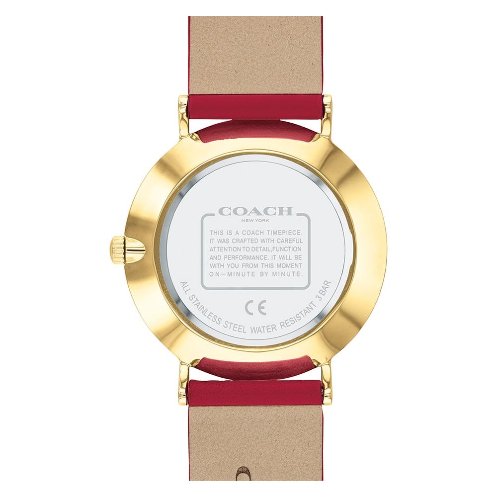 Take on the world with Coach Perry's Red Leather Women's Watch. Crafted with Ionic thin gold-plated steel and a mineral crystal for durability, it's a daring statement piece with a 36 mm case diameter and 18 mm band width. The vibrant red dial and calfskin strap make it as bold as you are. Rise to every challenge with style!