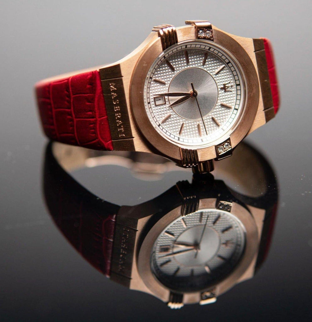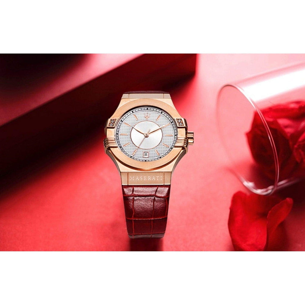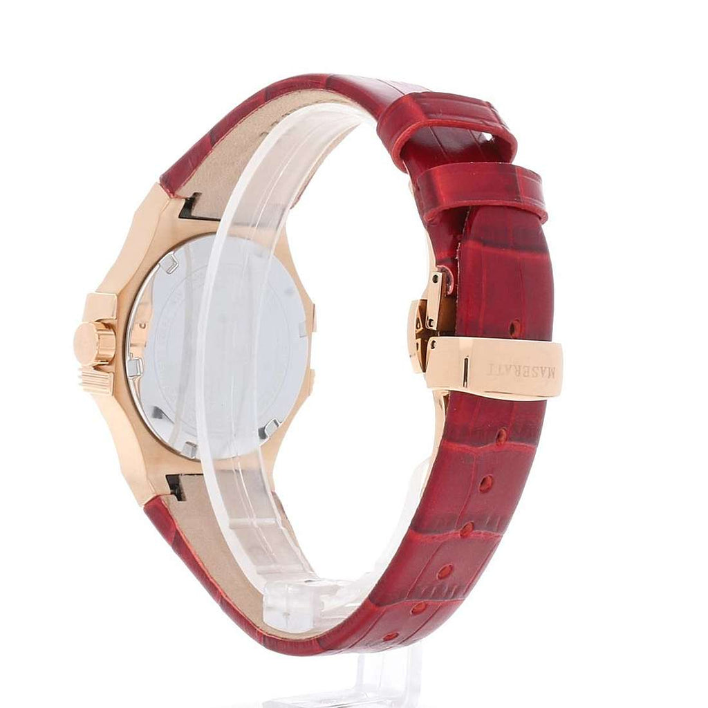 Rose gold PVD stainless steel case with a red leather strap. Fixed rose gold PVD bezel set with 4 diamonds. Silver dial with rose gold-tone hands and index hour markers. Minute markers around the outer rim. Dial Type: Analog. Date display at the 6 o'clock position. Hattori calibre VJ42 quartz movement. Scratch resistant mineral crystal. Screw down crown. Solid case back. Round case shape. Case size: 35 mm. Case thickness: 10 mm. Band width: 16 mm. Tang clasp. Water resistant at 100 meters / 330 feet. Functions: date, hour, minute, second. Potenza Series. Dress watch style. Watch label: Japan Movt. Maserati Potenza Chronograph Silver Dial Ladies Watch R8851108501.
