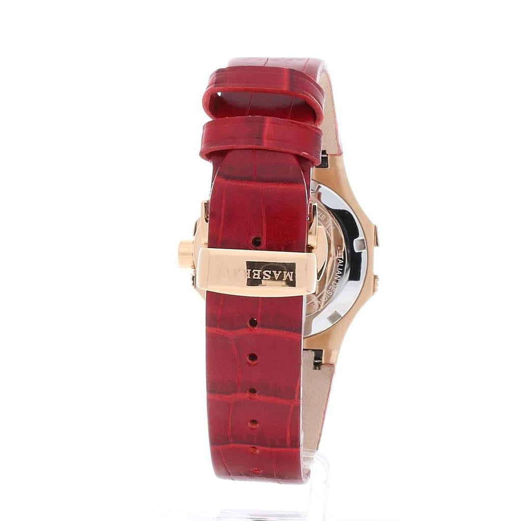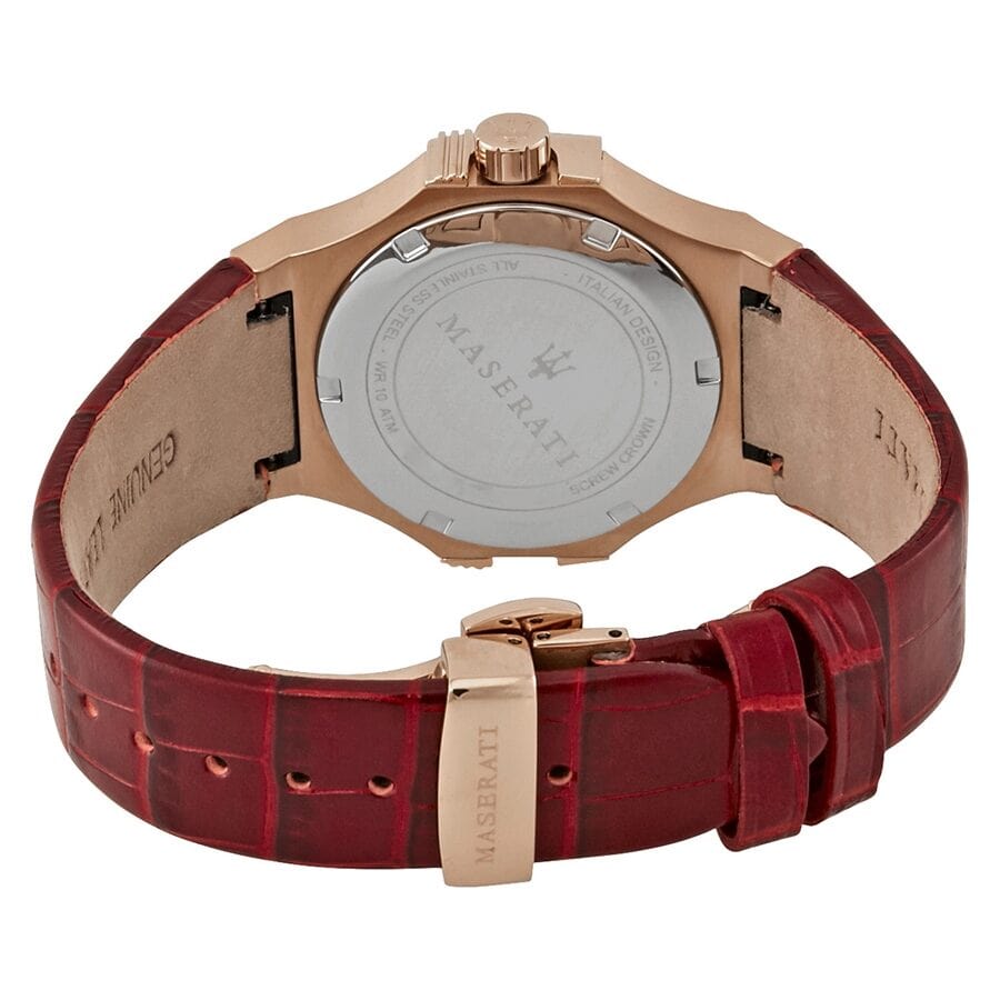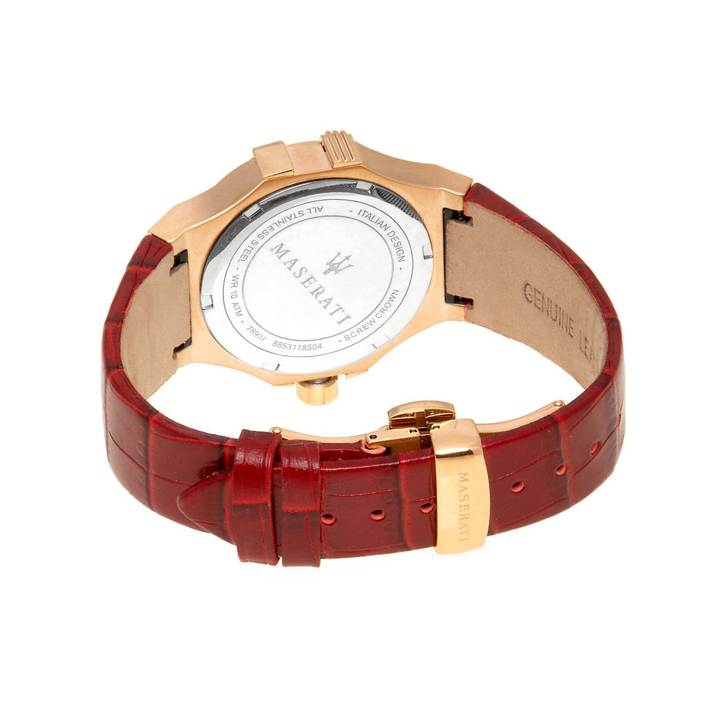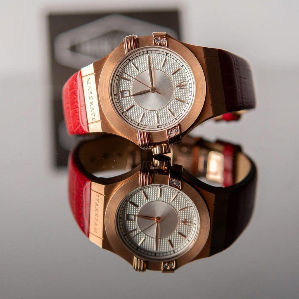 Rose gold PVD stainless steel case with a red leather strap. Fixed rose gold PVD bezel set with 4 diamonds. Silver dial with rose gold-tone hands and index hour markers. Minute markers around the outer rim. Dial Type: Analog. Date display at the 6 o'clock position. Hattori calibre VJ42 quartz movement. Scratch resistant mineral crystal. Screw down crown. Solid case back. Round case shape. Case size: 35 mm. Case thickness: 10 mm. Band width: 16 mm. Tang clasp. Water resistant at 100 meters / 330 feet. Functions: date, hour, minute, second. Potenza Series. Dress watch style. Watch label: Japan Movt. Maserati Potenza Chronograph Silver Dial Ladies Watch R8851108501.