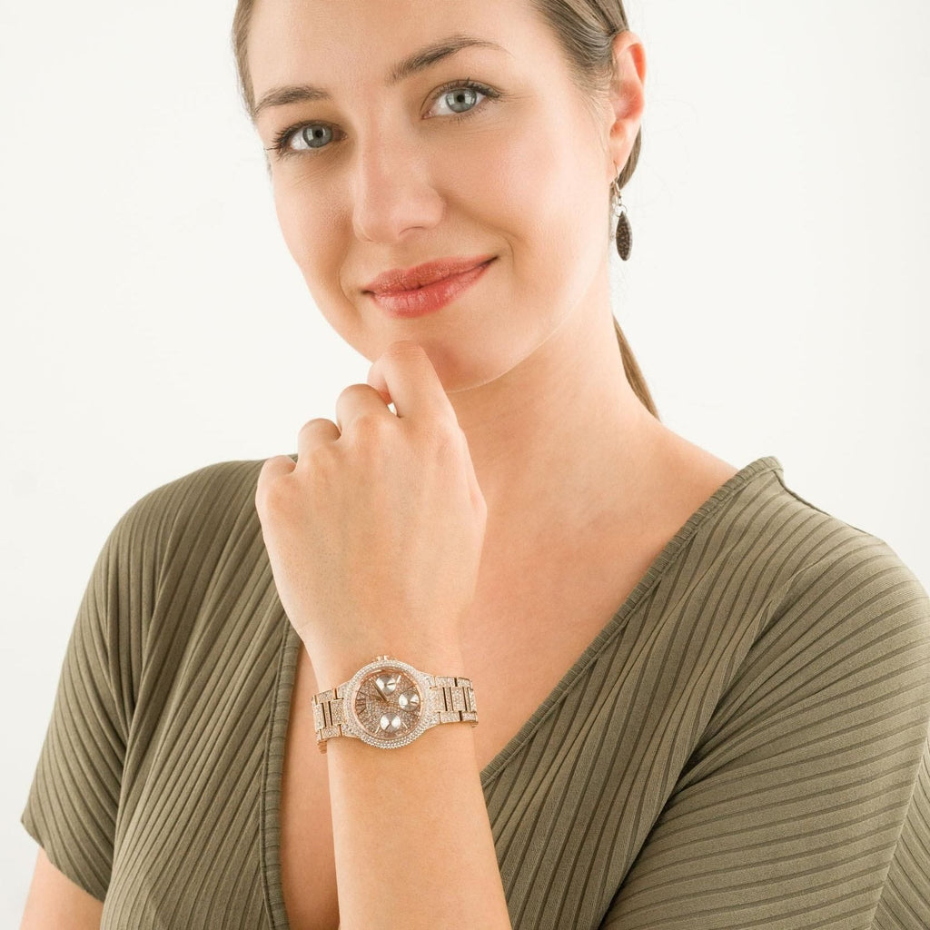 Our Camille watch strikes the perfect balance between bold and elegant. With an all-pavé accent in a stingray-inspired motif, this modern rose gold-tone timepiece boasts polished hour markers and embellished sub-dials for added glamour. Wear it with everything from cool casuals to tailored office attire.