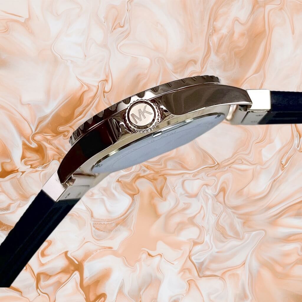Upgrade your accessory collection with this women's analog watch from Michael Kors. The rose gold round dial is protected by a mineral glass. Michael Kors' 43mm Everest watch features a rose gold pave dial, three-hand and black silicone strap. Besides, it is completed with a buckle clasp to ensure a secure fit on the wrist.