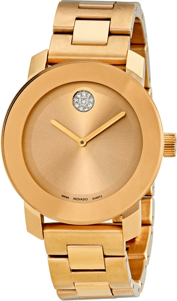 Rose gold-tone stainless steel case and bracelet. Fixed Rose gold-tone bezel. Gold-tone dial with gold-tone hands. No markers. Crystal-set Movado dot appears at the 12 o'clock position. Dial Type: Analog. Quartz movement. Scratch resistant mineral crystal. Push / pull crown. Solid case back. Case size: 36 mm. Case thickness: 10 mm. Round case shape. Band width: 18 mm. Push button deployment clasp. Water resistant at 30 meters / 100 feet. Functions: hours, minutes. Dress watch style. Watch label: Swiss Made. Movado Bold Rose Gold-Tone