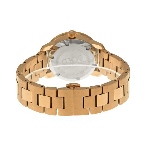 Rose gold-tone stainless steel case and bracelet. Fixed rose gold-tone bezel. Rose dial with rose gold-tone hands. No markers. The Movado dot appears the 12 o'clock position. Dial Type: Analog. Quartz movement. Scratch resistant K1 mineral crystal. Solid case back. Case diameter: 36 mm. Round case shape. Band width: 17 mm. Deployment clasp. Water resistant at 30 meters / 100 feet. Functions: hour, minute. Dress watch style. Movado Bold Rose Dial Rose Gold-tone Stainless Steel Ladies Watch