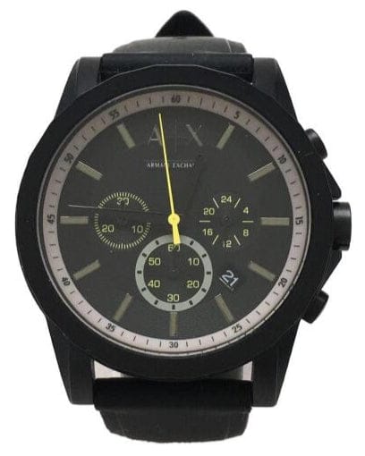 Armani Exchange's 44mm watch features a matte black dial with light gray stick indexes and a yellow second hand, chronograph movement and black silicone strap.