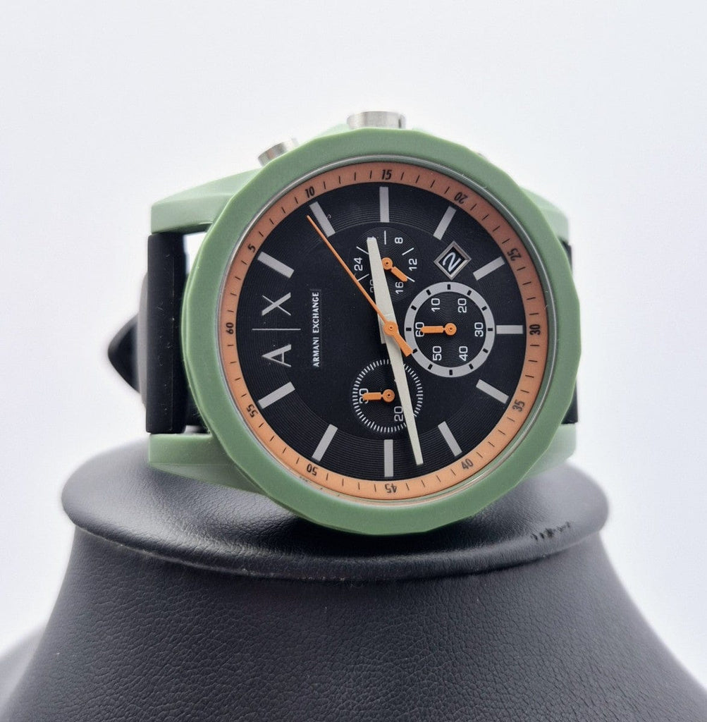 Upgrade your style with the Armani Exchange Outerbanks Chronograph Watch for men. Its sleek black dial and silicone strap exude effortless sophistication, while the chronograph feature allows for precision timekeeping. Make a statement with this bold and trendy timepiece.