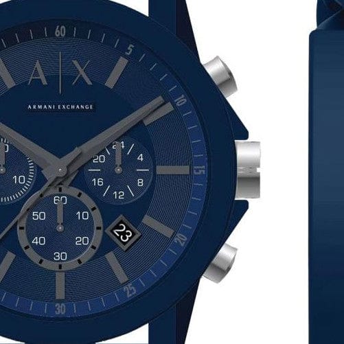 Scratch resistant mineral crystal. Pull / push crown. Solid case back. Round case shape. Case size: 44 mm. Case thickness: 12 mm. Band width: 22 mm. Tang clasp. Water resistant at 30 meters / 100 feet. Functions: chronograph, date, hour, minute, second. Additional Info: a bracelet is included. Outerbanks Series. Dress watch style. Armani Exchange Outerbanks Chronograph Quartz Blue Dial Men's Watch AX7128.