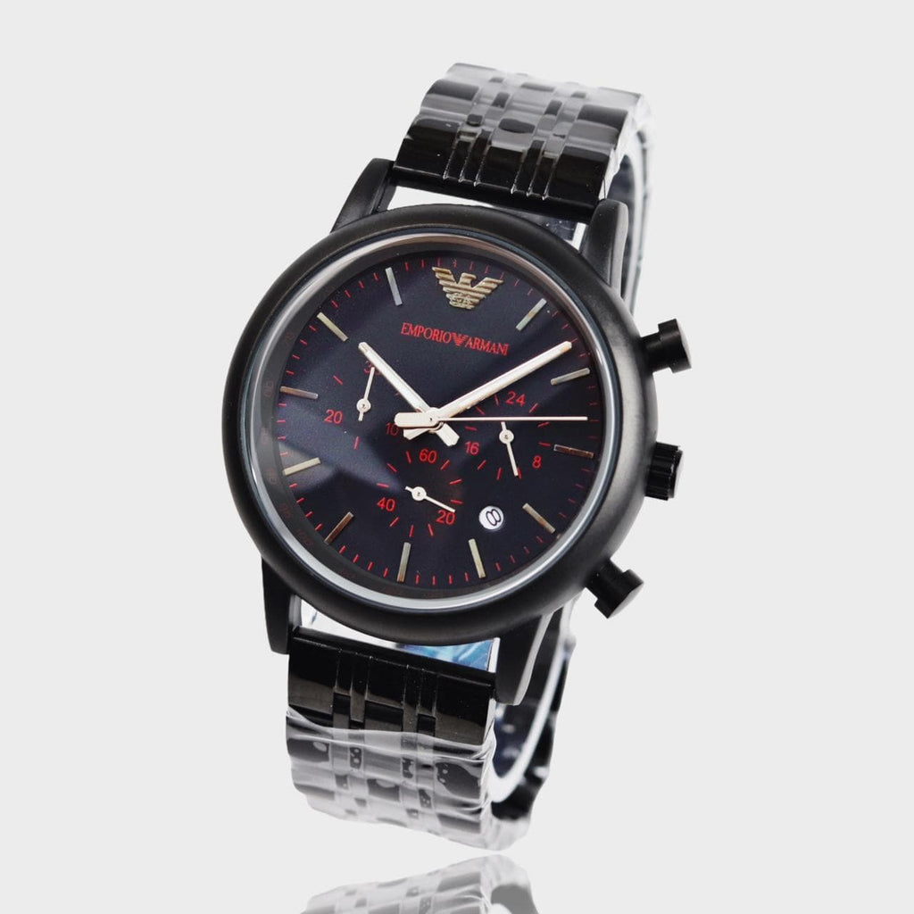 Water resistant at 50 meters / 165 feet. Functions: chronograph, tachymeter, date, hour, minute, second. Dress watch style. Armani Luigi Chronograph Black Dial Men's Watch AR11024.