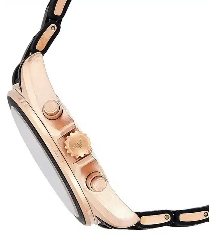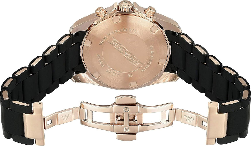 Emporio Armani is a beautiful, interesting, and well-made watches that suit the needs of every customer. It features a rose gold-tone stainless steel case with a black rubber strap. Fixed rose gold-tone bezel with a black top ring.