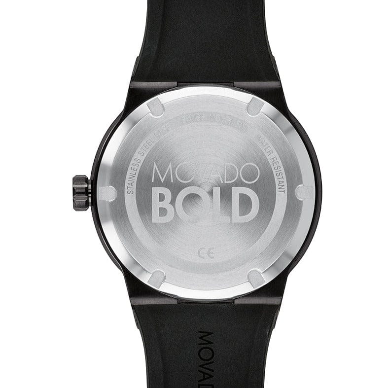 Black ion-plated stainless steel case with a black silicone strap. Fixed black ceramic bezel. Black dial with silver-tone hands and index hour markers. The Movado dot appears at the 12 o'clock position. Dial Type: Analog. Date display at the 3 o'clock position. Quartz movement. Scratch resistant k1 mineral crystal. Pull / push crown. Solid case back. Round case shape. Case size: 42 mm. Band width: 21 mm. Tang clasp. Water resistant at 30 meters / 100 feet. Functions: date, hour, minute, second. Casual watch style. Movado Bold Quartz Black Dial Men's