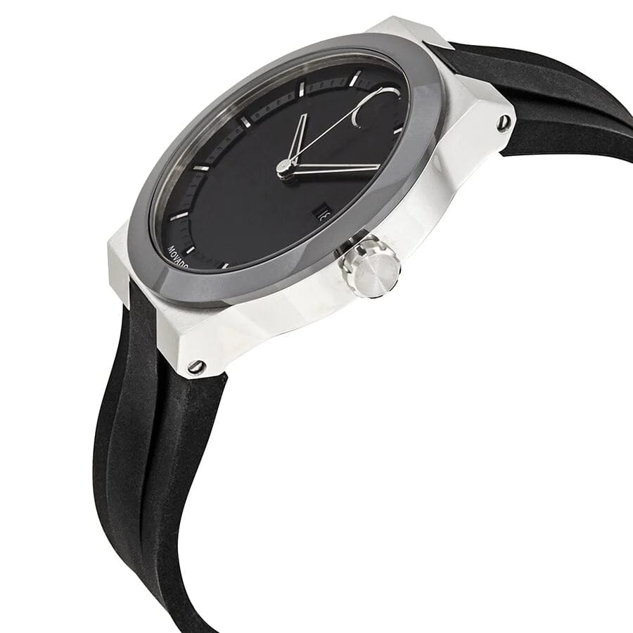 Stainless steel case with a black silicone strap. Fixed black ceramic bezel. Black dial with silver-tone skeleton hands and index hour markers. Minute markers around the outer rim. The Movado dot appears at the 12 o'clock position. Dial Type: Analog. Date display at the 3 o'clock position. Quartz movement. Scratch resistant K1 mineral crystal. Pull / push crown. Solid case back. Round case shape. Case size: 42 mm. Case thickness: 10 mm. Band width: 24 mm. Tang clasp. Water resistant at 30 meters / 100 feet. Functions: date, hour, minute,