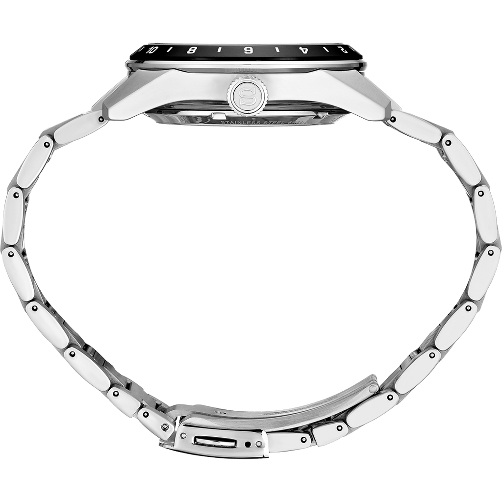 This watch, in the popular Presage Sharp Edged series, is designed for practical international timekeeping. The GMT hand and high visibility hour markers, along with clear 24-hour bezel, mean multiple time zone calculations can be made at a glance, quickly and easily.