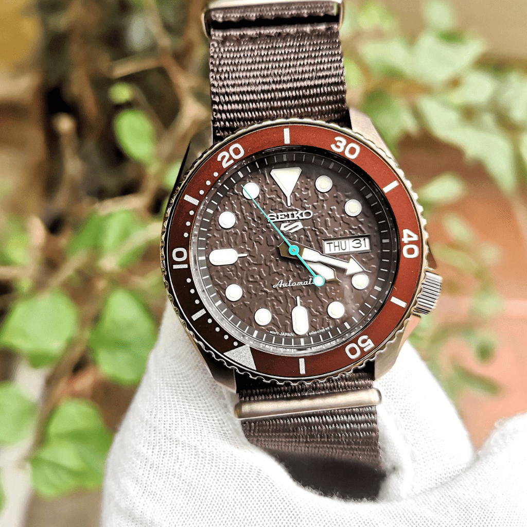 Seiko 5 watches deliver amazing quality at their pocket friendly price point. Seiko keeps delivering new variants in an incredible array of colours. This chocolate brown edition, which carries through the face, case, bezel and strap, is accented beautifully by its green second hand. A cool everyday wear, that’s just a bit different.