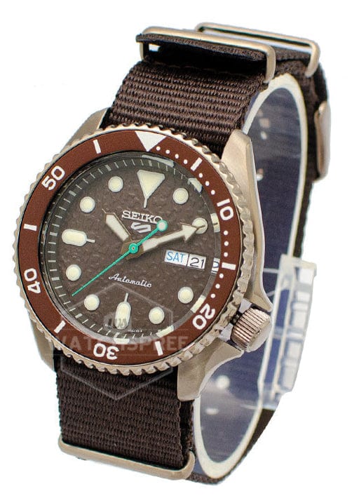 Bracelet/ Strap: Brown Seiko NATO acrylic strap.